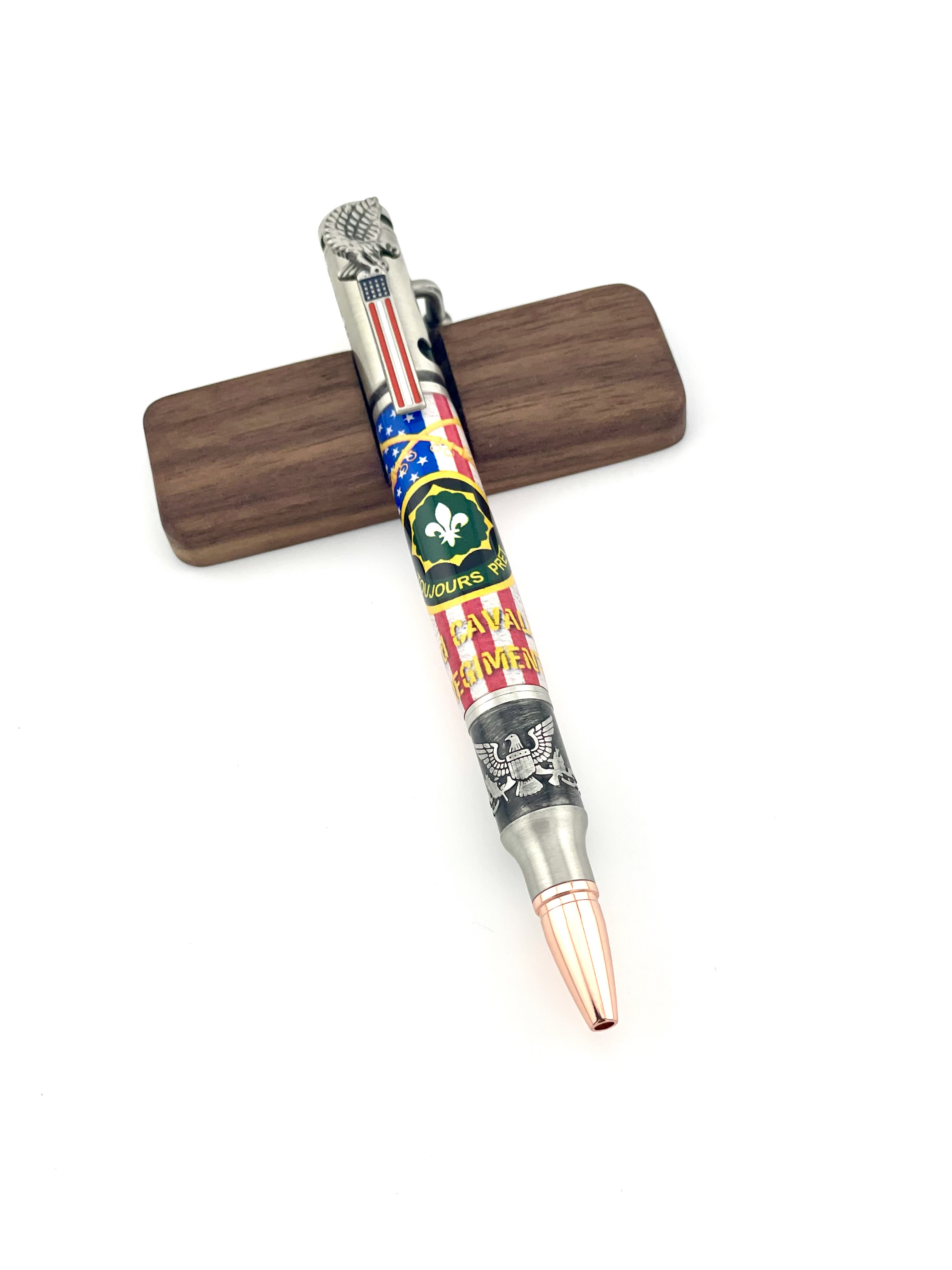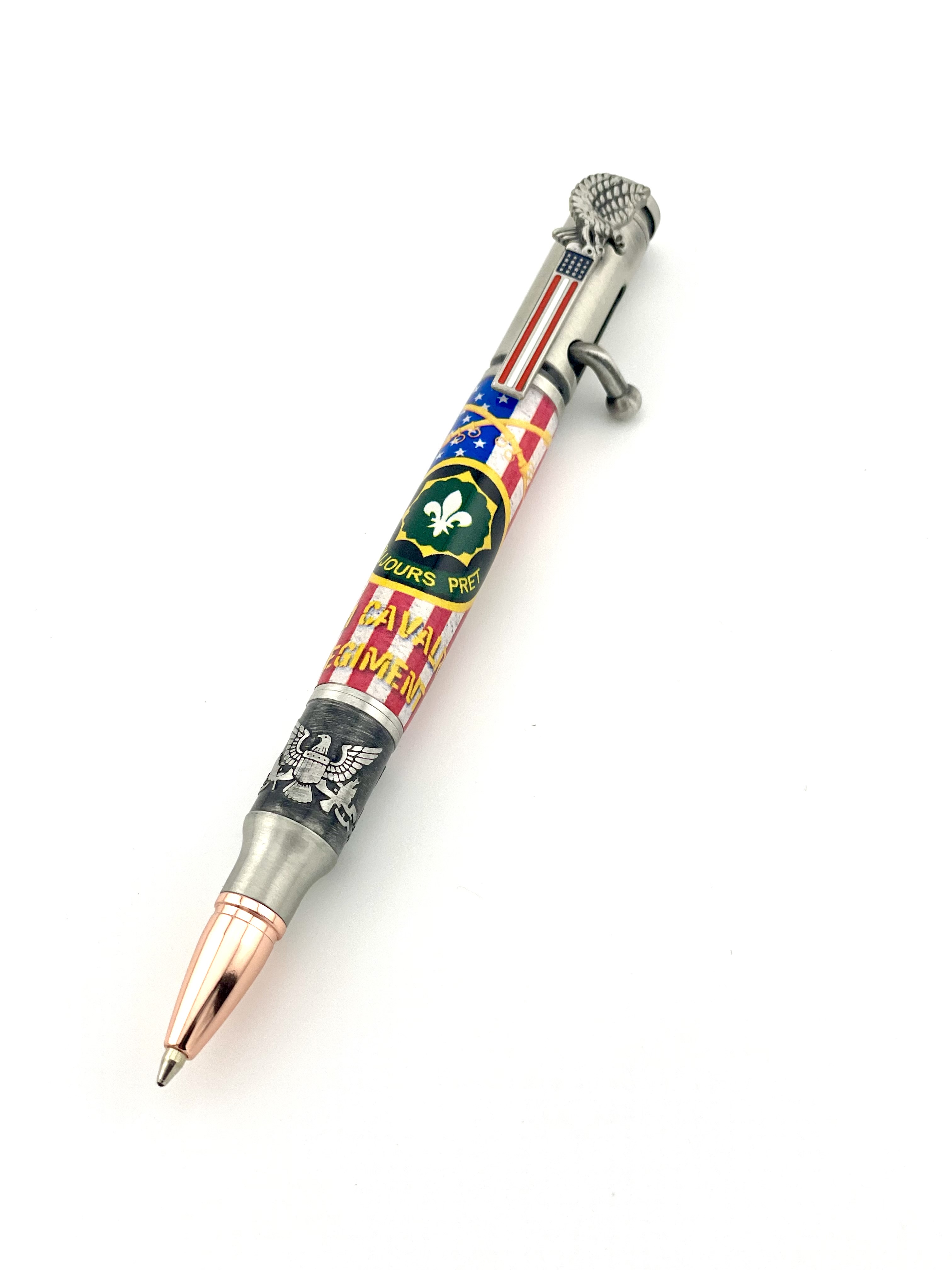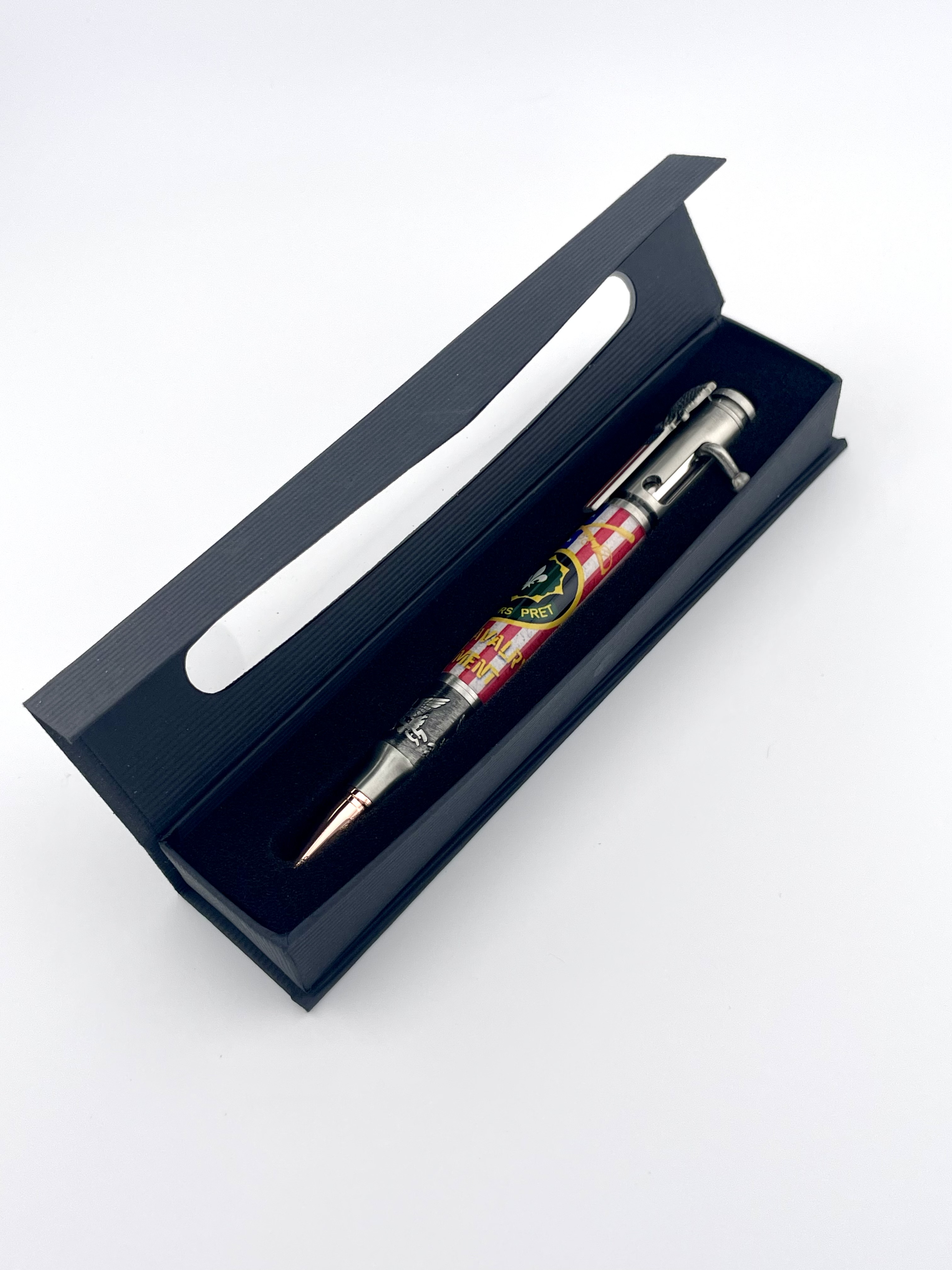 This bolt-action pewter finish pen is hand-turned and polished with a custom designed resin cast center barrel. Great for PCS, ETS, Impact Award, or Retirement Memento.