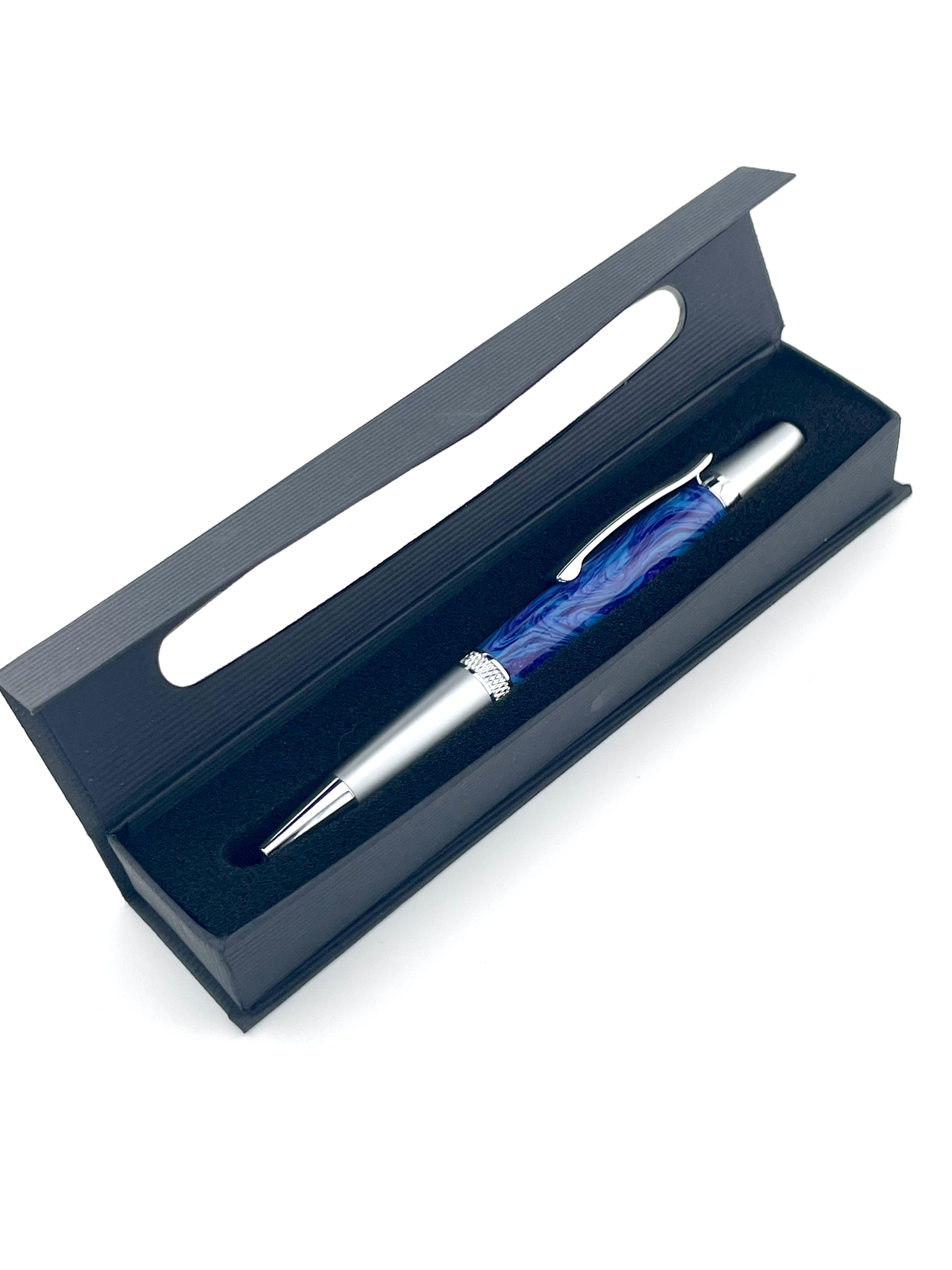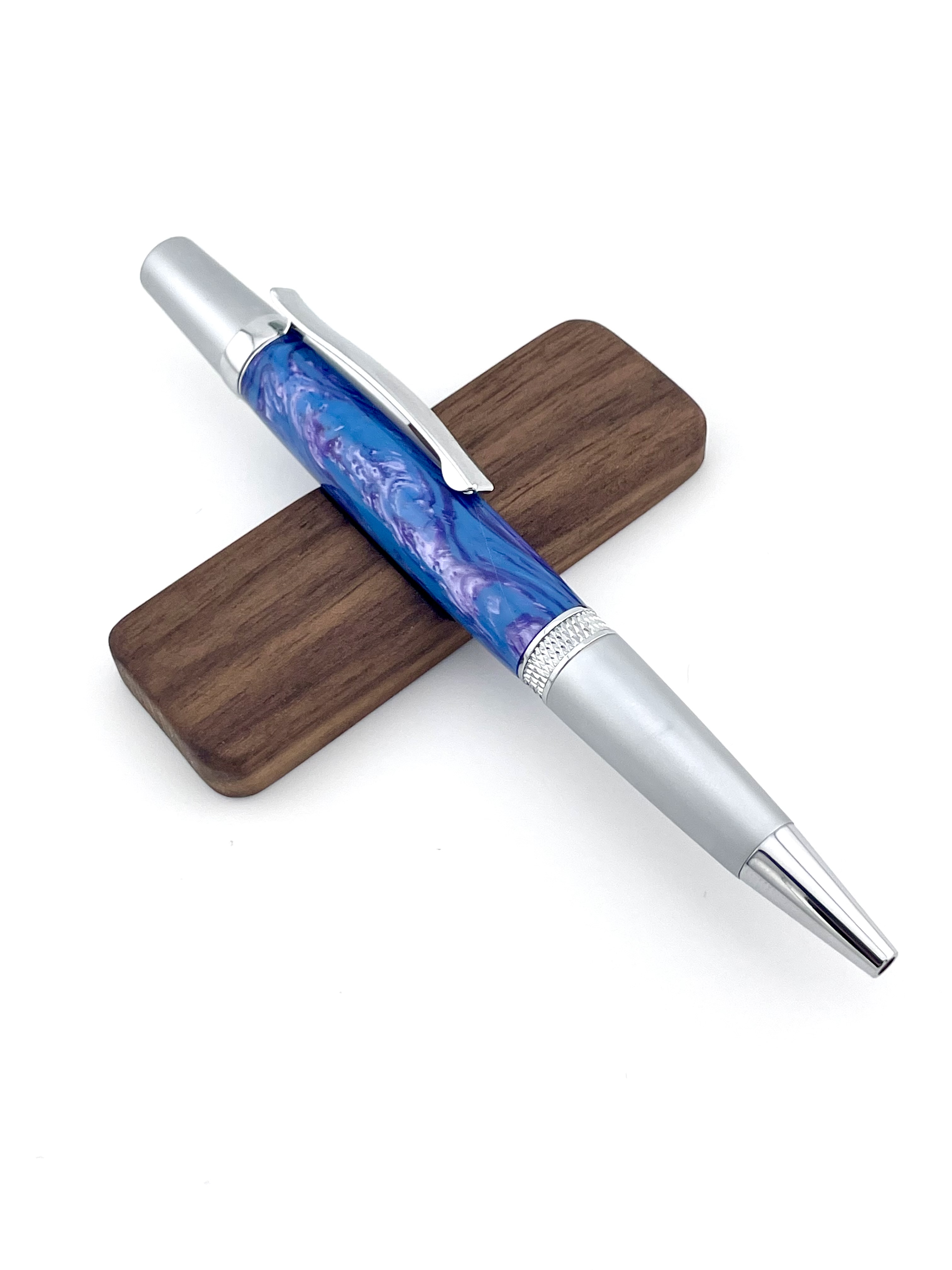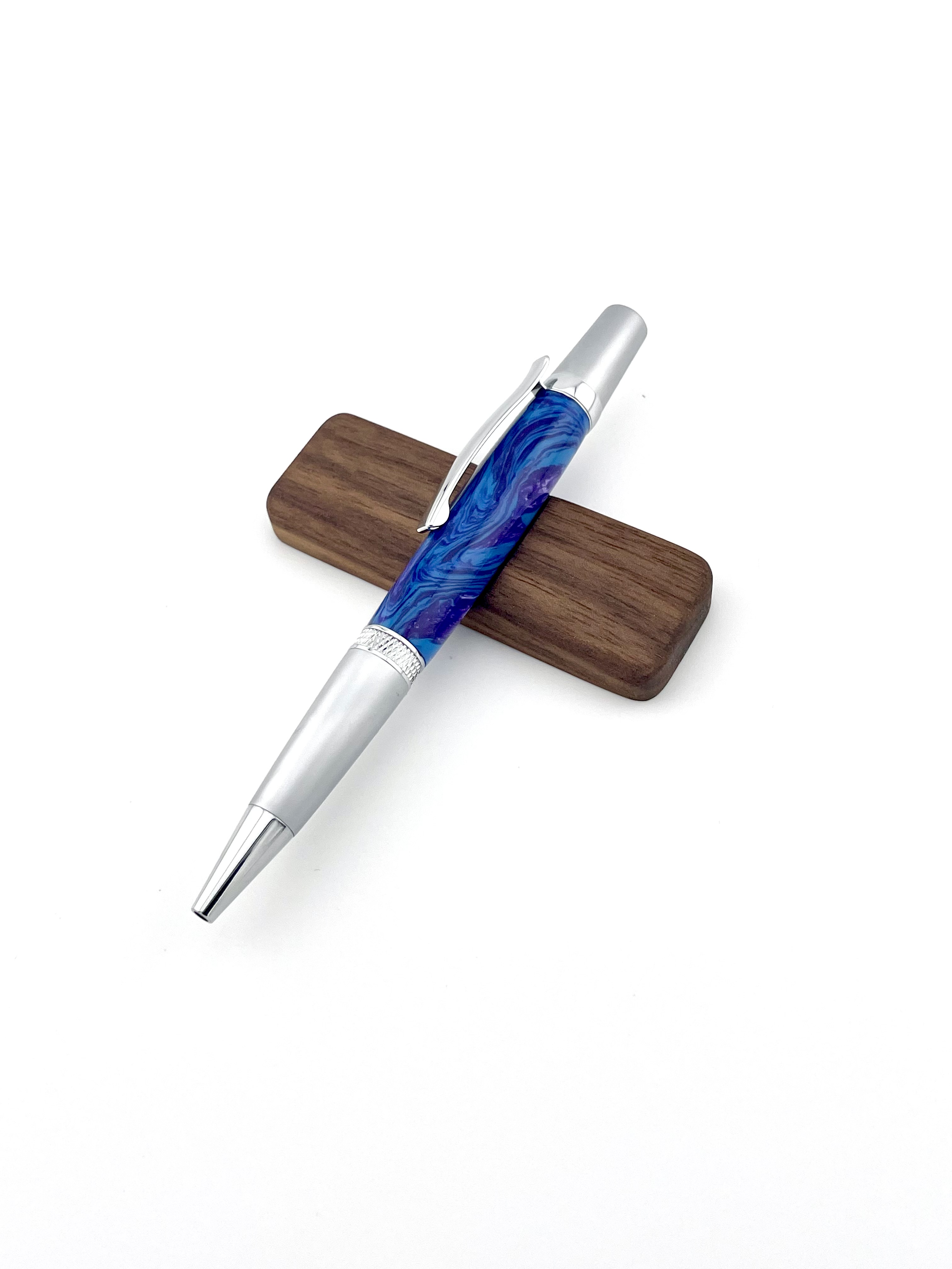 Experience everyday writing with a touch of craftsmanship and color. This handcrafted pen from Allen Inkworks features a vibrant blue and purple swirl body, paired with sleek satin-finished aluminum ends for a modern, professional look. Designed with a smooth twist mechanism, this pen offers easy, reliable operation — no clicks, no fuss, just a simple twist to engage and write.